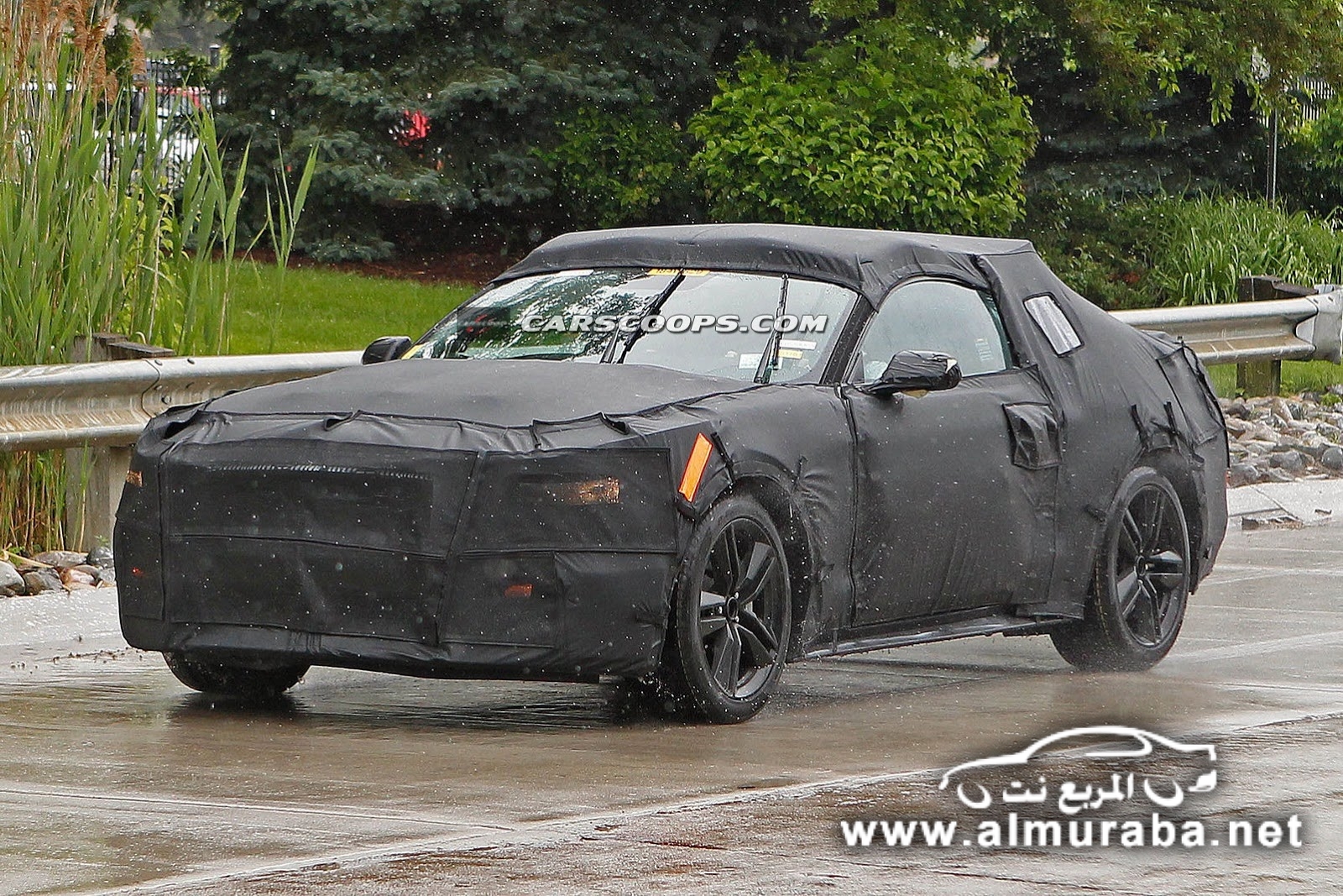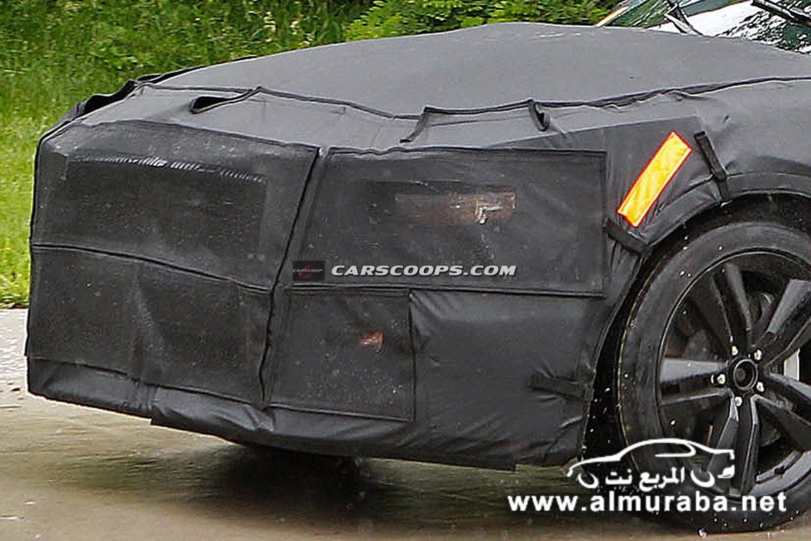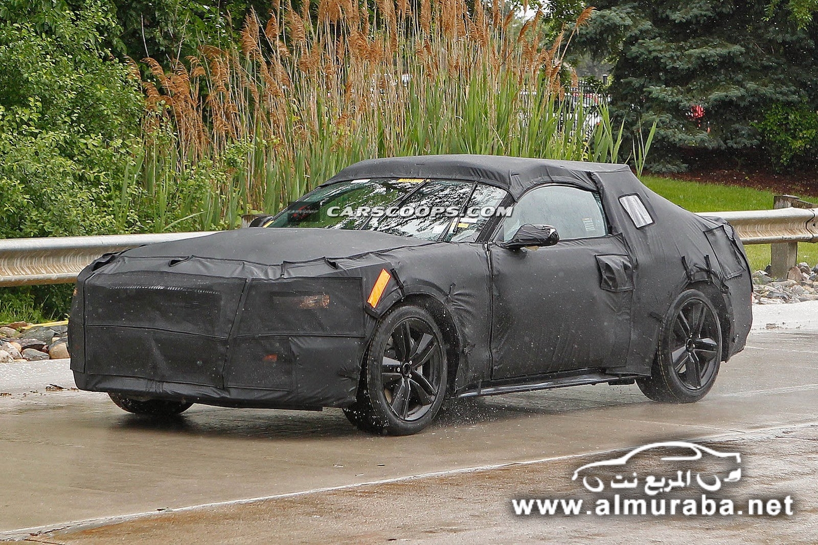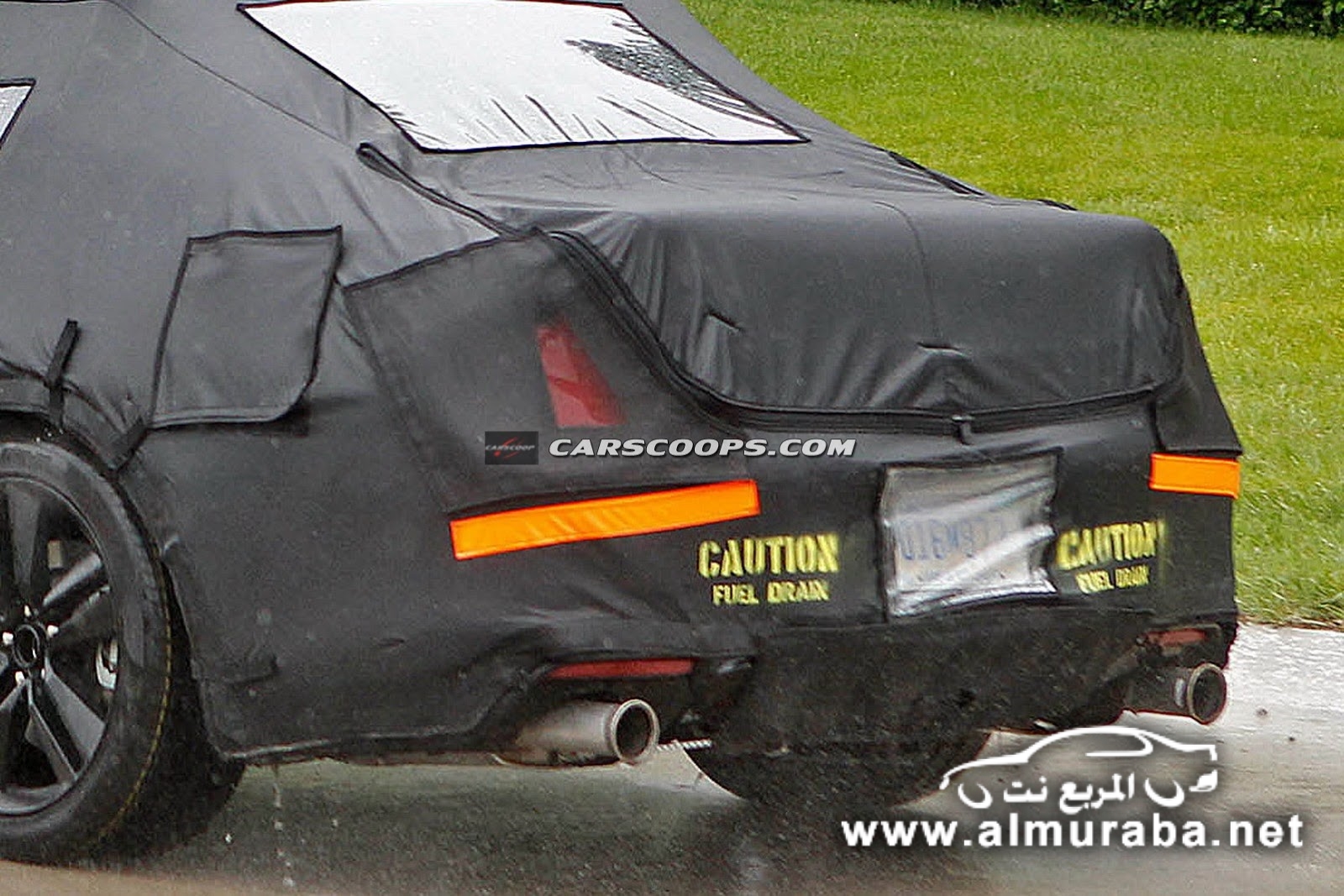 تحت غطاء يغطي سيارة الإنتاج الفعلي من الجيل السادس للسيارة فورد موستنج، والغطاء المستخدم يلف كافة السيارة من جميع الجهات بحيث لا يسمح لأي أحد ان يشاهد أي جزء من السيارة حتى السقف.