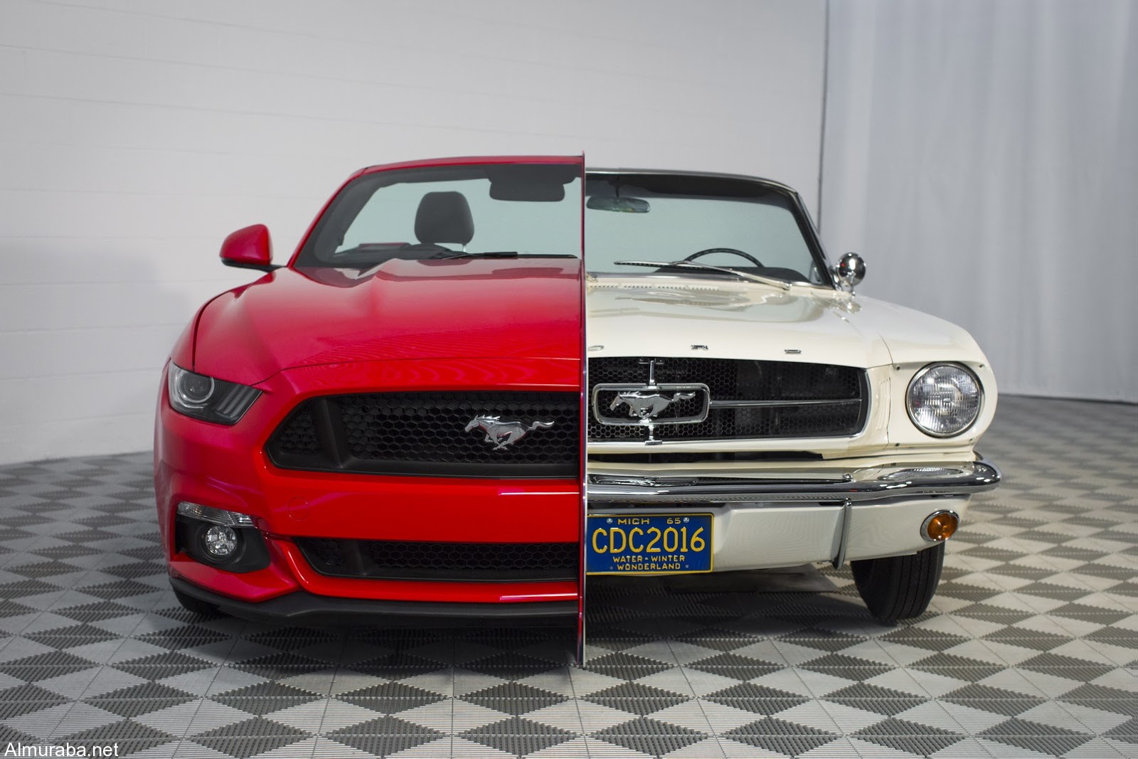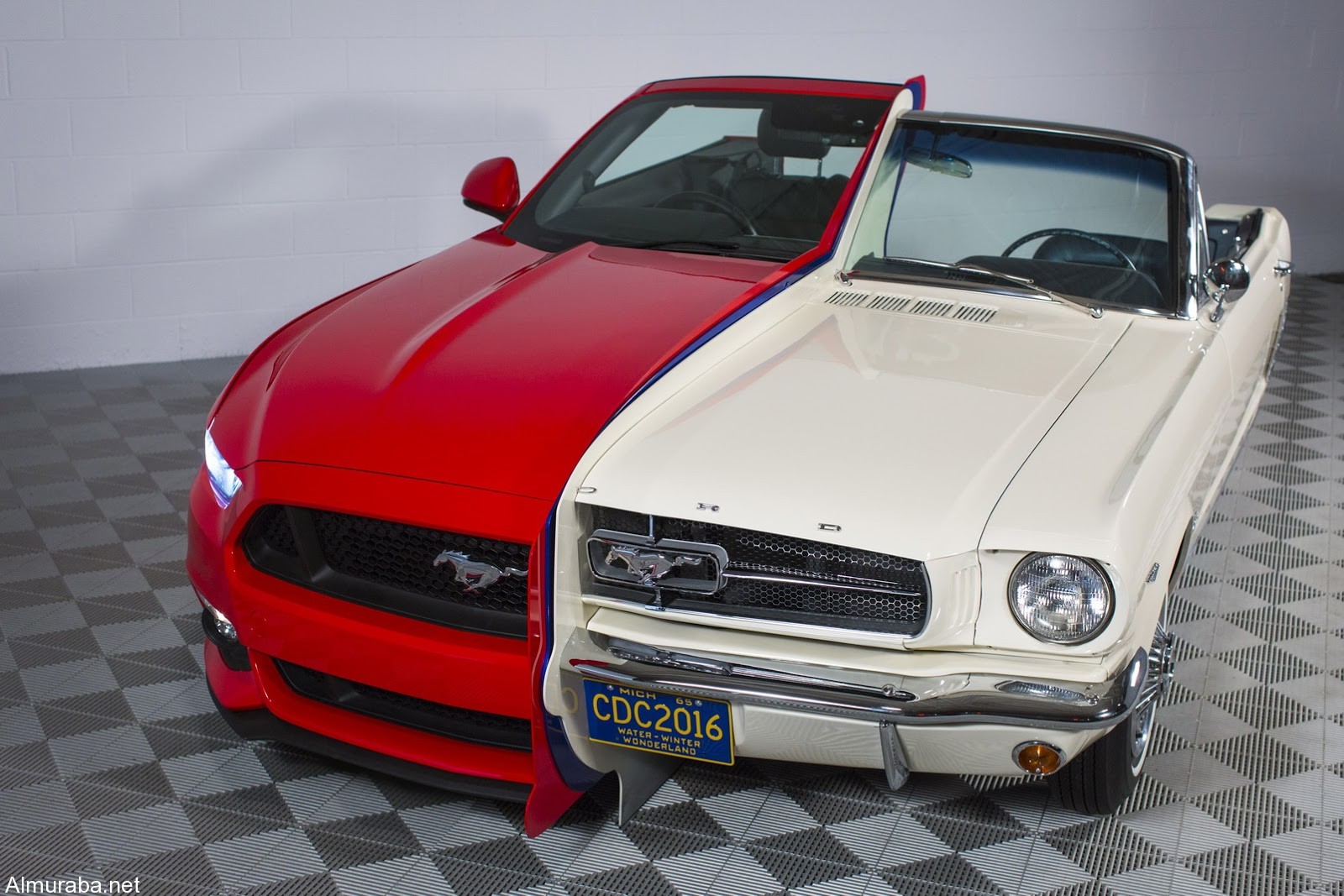 المربع نت – لإظهار التشابهات والاختلافات الحادة بين سيارة موستانج 1965 الأصلية ولاحقتها موديل 2015، قامت فورد بشق السيارتين ودمجهم في هيكل واحد.
