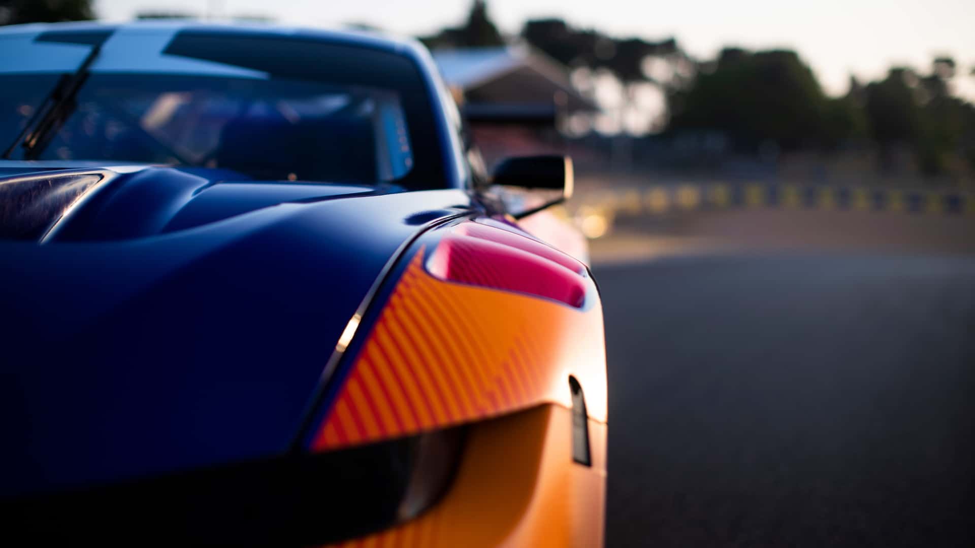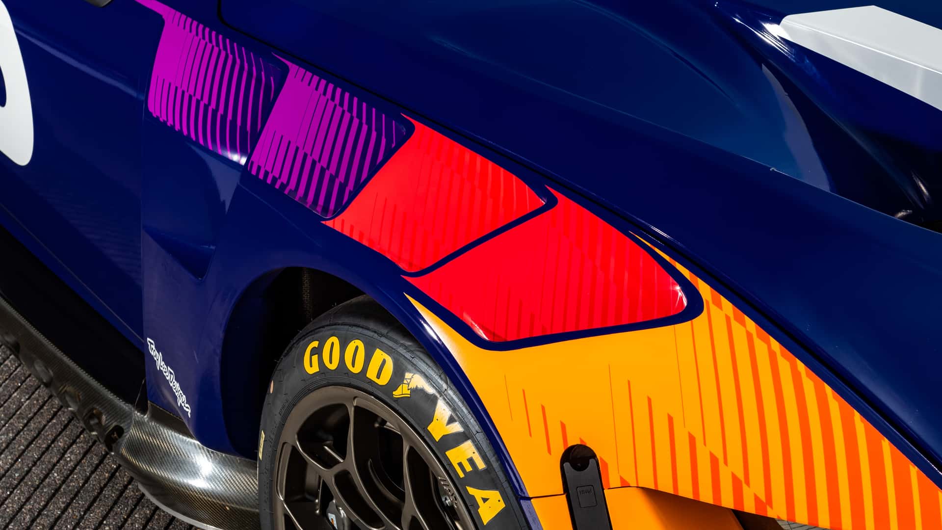 كما تأتي سيارة السباق بجناح ضخم ومشتت هواء خلفي كبير.. كما تحظى بخارجية ملونة تجمع بين البرتقالي والأزرق والبنفسجي والأحمر، ونرى شعار FP الجديد لقسم Ford Performance عالي الأداء.