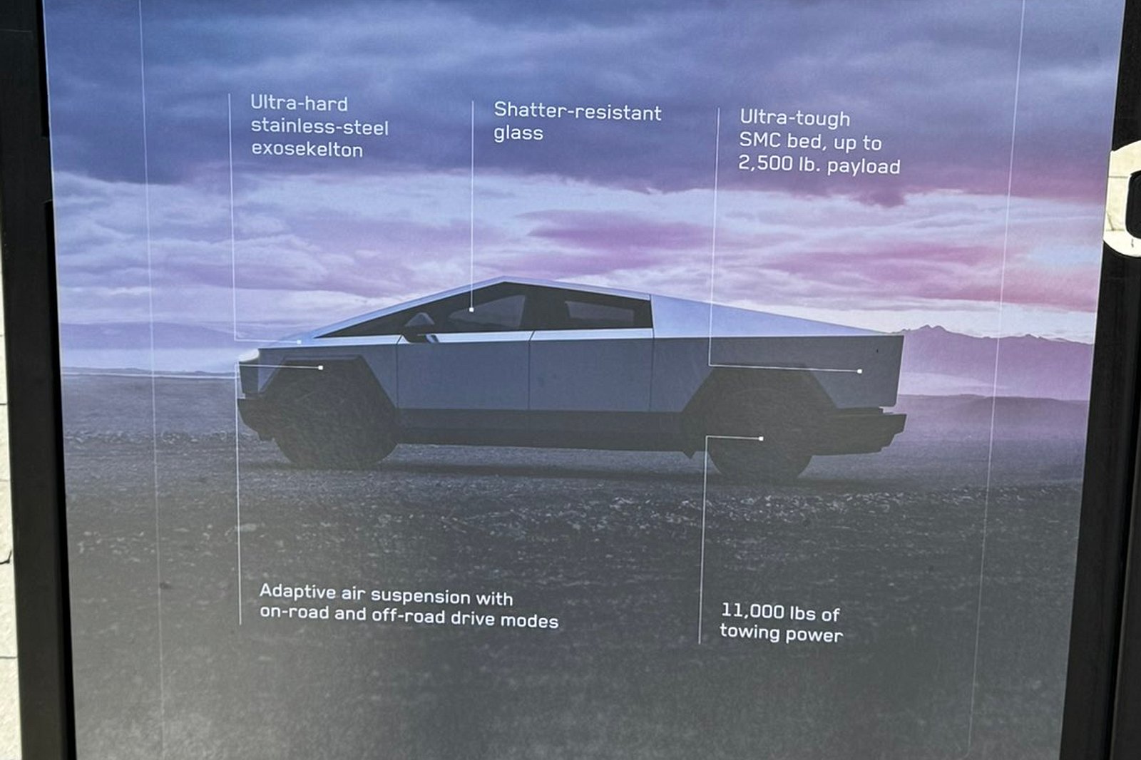 في صالة عرض تيسلا في سان دييغو التقط أحد الأشخاص صورة للافتة مثبتة بجوار الشاحنة والتي تحتوى على قدرات سايبرتراك الكهربائية من حيث الحمولة القصوى التي تبلغ 1,134 كيلوجرام و قدرة السحب القصوى التي تصل إلى 4,990 كيلوجرام.