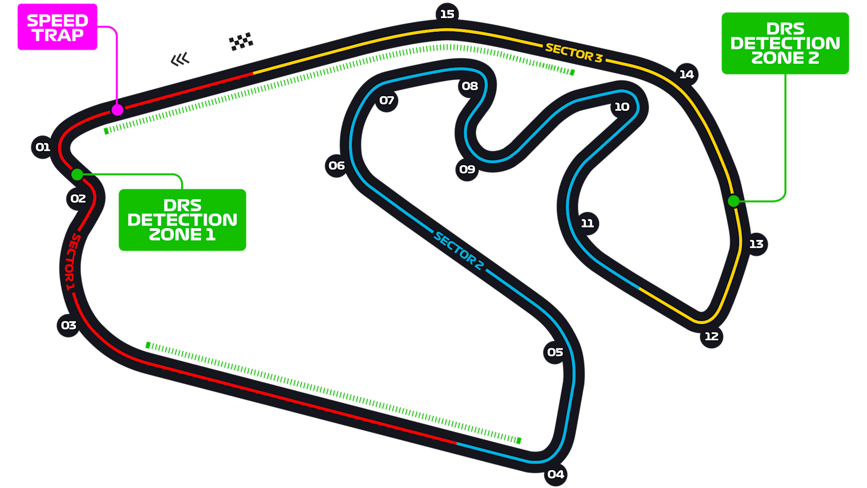 مناطق دي أر أس: منطقتين بين المنعطف 3و4 وبين منعطف 15و1