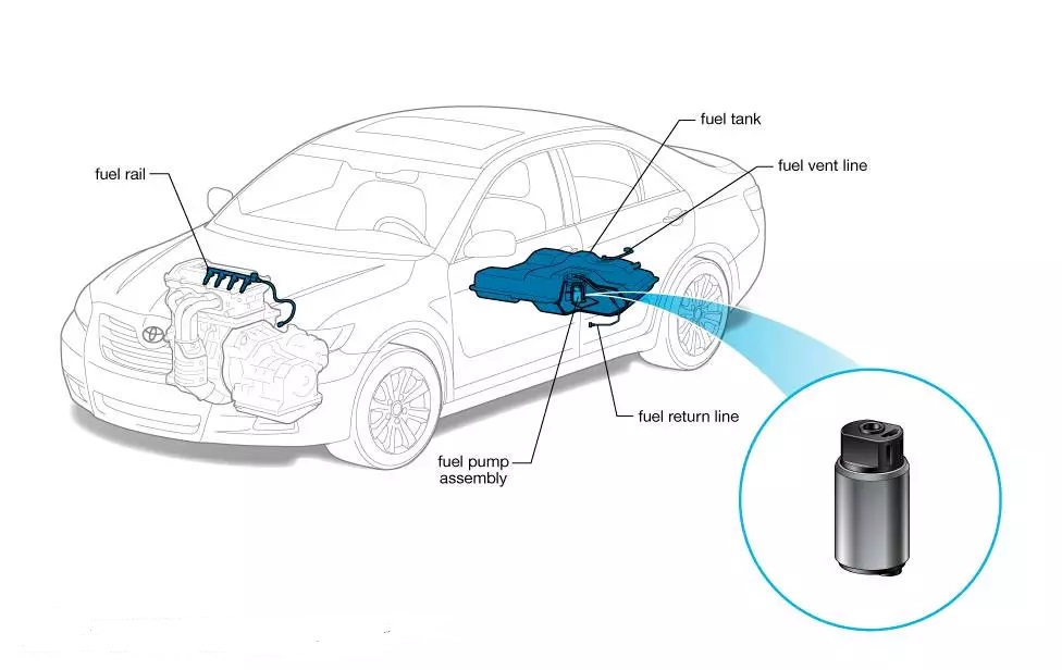 مضخة الوقود/ البنزين “Fuel pump”: وظيفتها الأساسية ضخ ونقل الوقود من الخزان إلي بخاخات الوقود ثم إلى غرفة الاحتراق عن طريق رفع ضغطه.