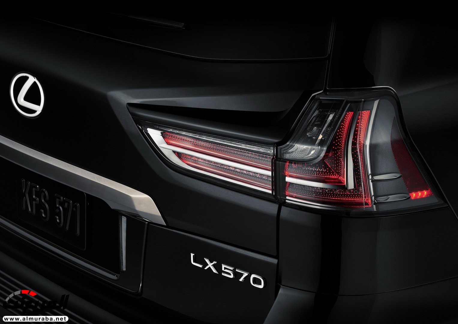 خارجية لكزس LX 2019 سلسلة الإلهام تتميز بطلاء أسود قاتم مع كروم أسود يحيط الشبكة والمصابيح والنوافذ ولوحة التسجيل والباب الخلفي، كما هنالك جنوط عجلات 21 إنش سوداء أيضاً.