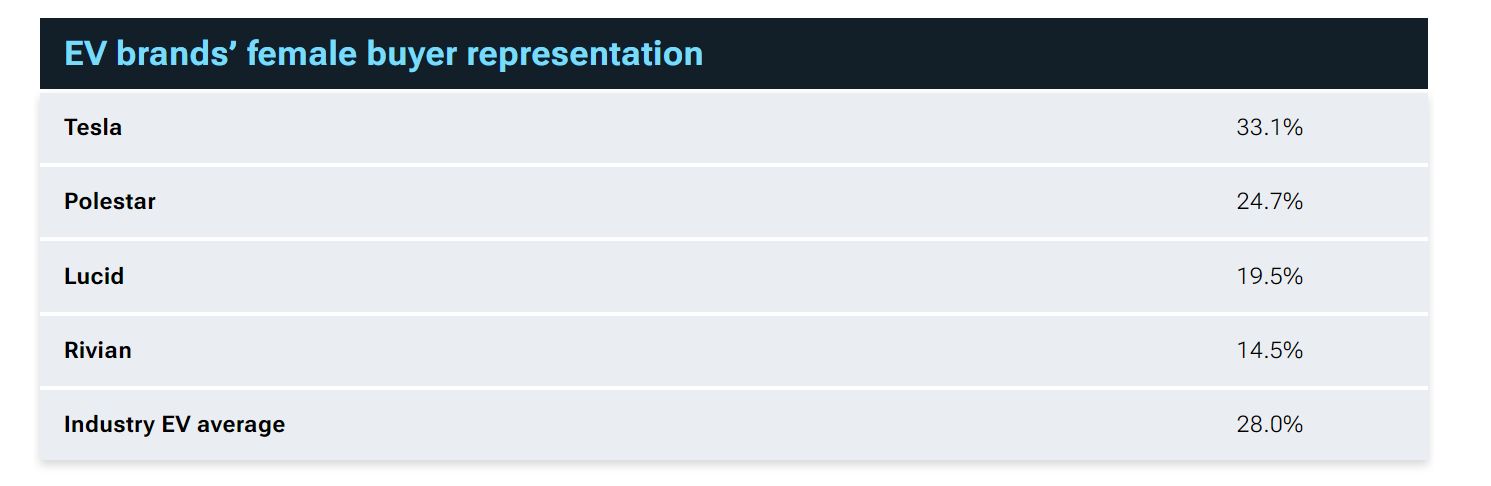البيانات صادرة من موقع S&P Global Mobility لعام 2022، ووضح التقرير أن تيسلا تحظى بأفضل دعم نسائي بنسبة 33.1% من ملاك سياراتها الجديدة، وفي المركز الثاني علامة بولستار السويدية بـ 24.7%، متبوعة بعلامة لوسيد بـ 19.5%، وينهار التمثيل النسائي بين ملاك مركبات ريفيان إلى 14.5% فقط.