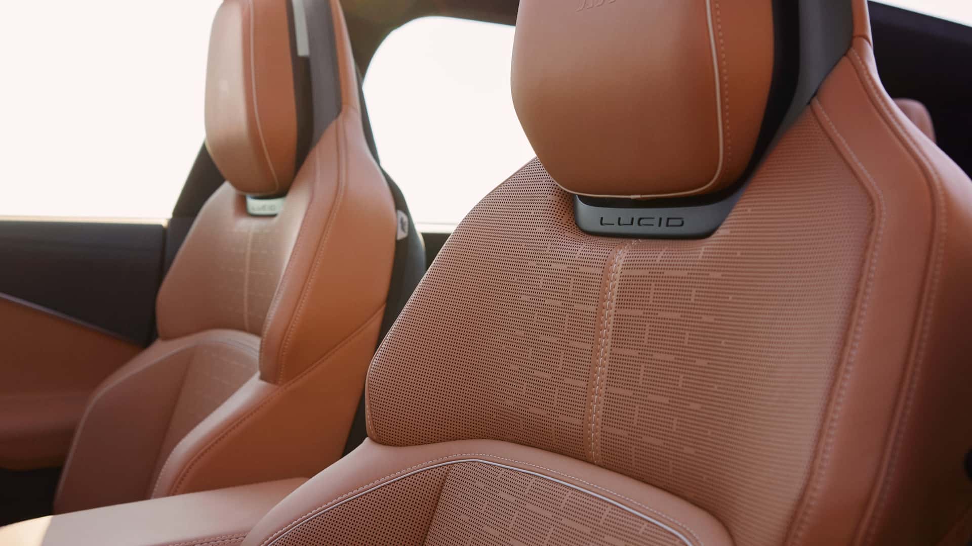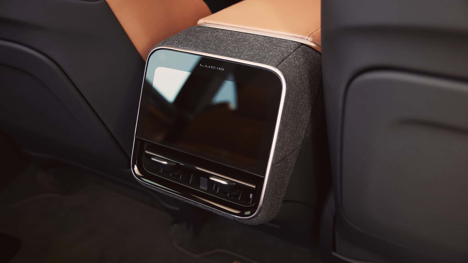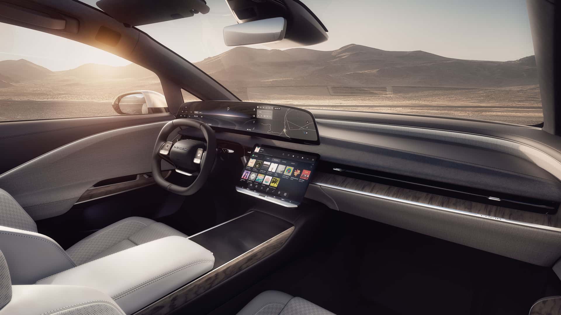 الداخلية زاخرة بالمزايا والخدمات الفاخرة كما هو متوقع من سيارات لوسيد، بإضاءة محيطية أنيقة، وأصوات نقية صادرة من النظام السمعي المتطور للسيارة.. ويمكن رؤية الشاشة العملاقة 34 إنش وراء المقود، مع شاشة أخرى مركزية فوق الكونسول الأوسط للتحكم في إعدادات السيارة والمناخ.