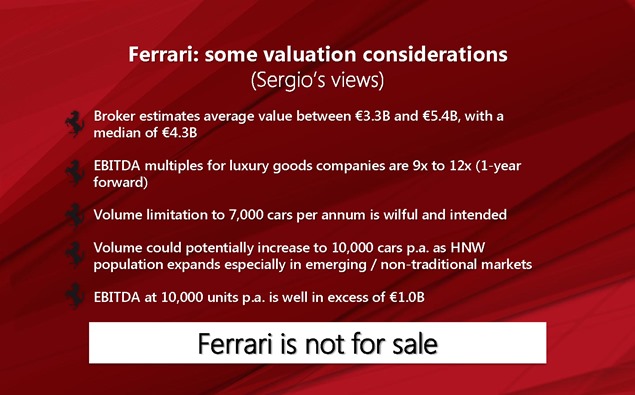 يقول ماركيوني: “ليس أن تقديرات المحللين تهم ، أن الشركة ليست للبيع، ولن تكون أبداً كان ذلك واضحا أكثر في خطة الخمس سنوات التي عرضت يوم أمس، مع واحدة من الشرائح التي تحتوي على سطر (فيراري ليست للبيع)”.