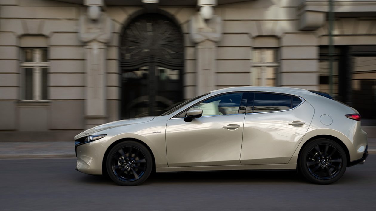 وعلى جانبي مازدا 3 هاتشبك 2024 نرى اللمسات الديناميكية والمظهر الشبابي للهاتشباك والذي يمنحها طابع عصري مميز، فيما تشمل التجهيزات مرايا جانبية تدعم الطي بشكل تلقائي مع مقابض للأبواب تأتي بنفس لون الهيكل مع إشارات انعطاف مدمجة، فيما ترتكز السيارة على عجلات مقاس 18 بوصة تأتي باللون الأسود.