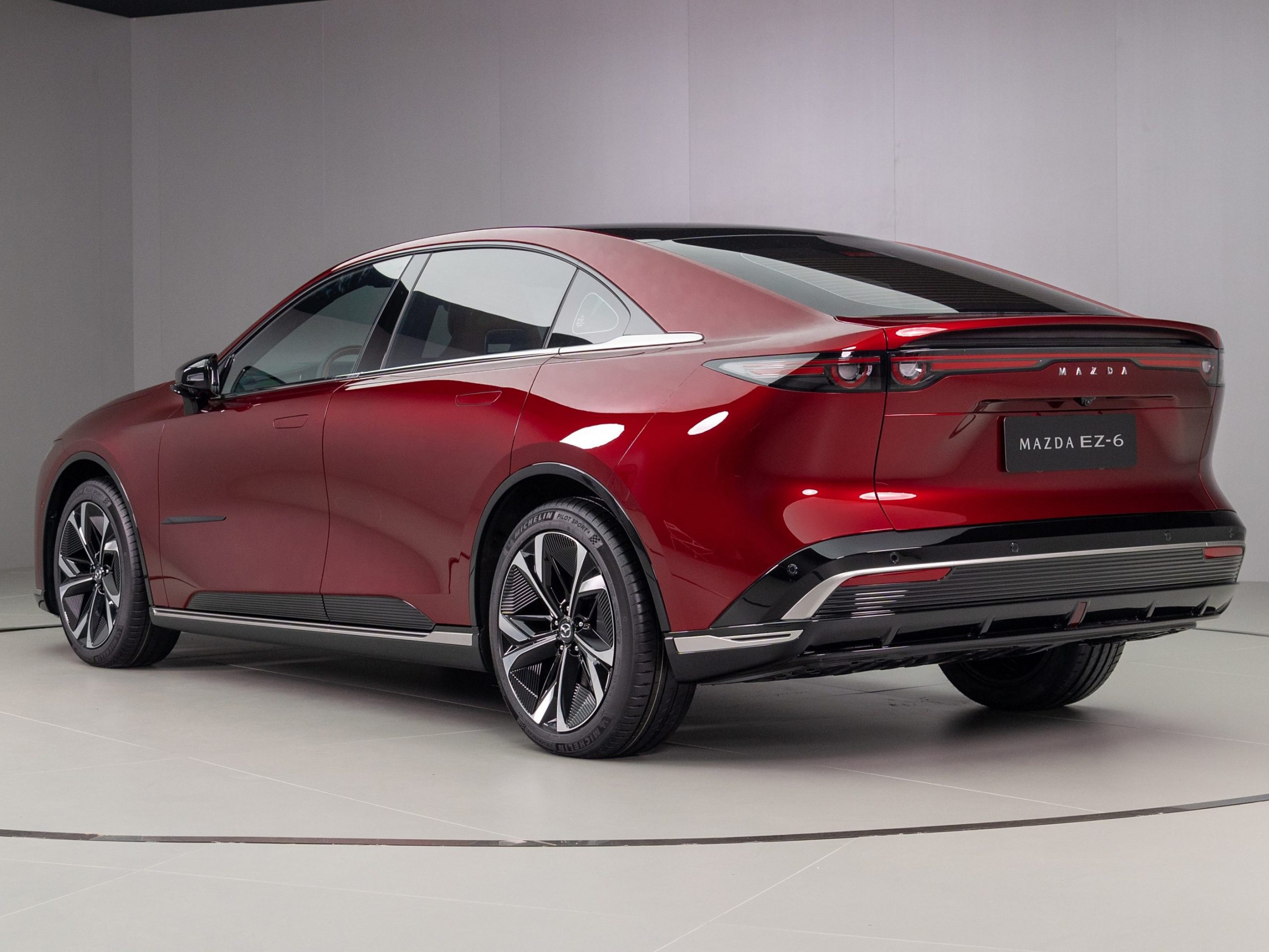بالوصول إلى المقطع الخلفي من مازدا EZ-6 الجديدة سوف نرى أنها حصلت على تصميم فاست باك رياضي والذي يدمج نهاية سقف السيارة مع نهاية غطاء صندوق الأمتعة الخلفي حيث يمكننا رؤية الجناح الكهربائي المدمج بنهاية السيارة، ويساعد الجناح الخلفي الكهربائي على تعزيز ثبات EZ-6 على السرعات العالية مع تحسين الديناميكية الهوائية.