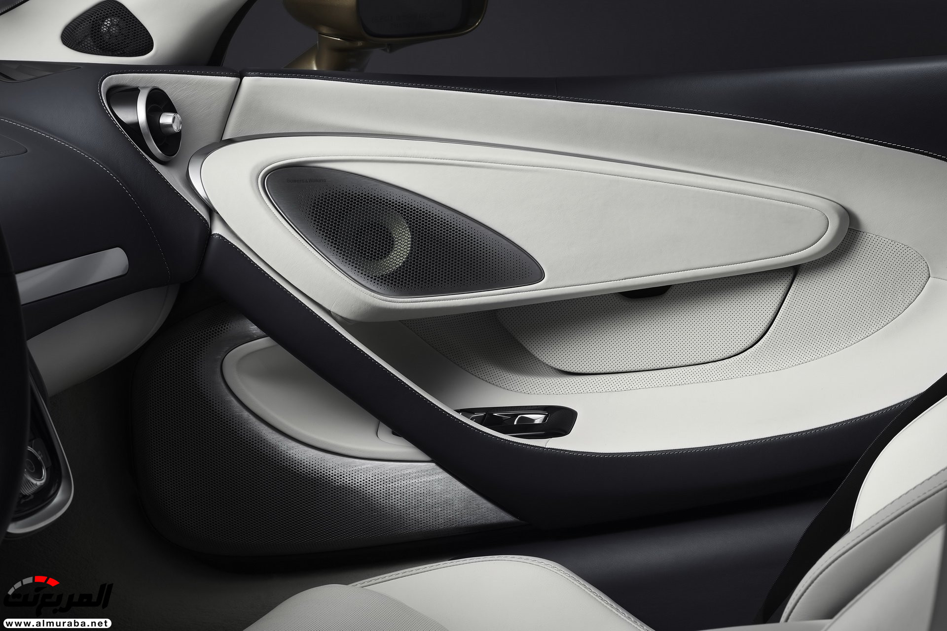 وبالمقصورة تجد تركيز على القيادة عالية الأداء وكذلك الرحلات الطويلة من خلال مقاعد عالية الراحة مع أنظمة تدفئة وتعديل الوضعية كهربائياً بجانب انتشار المواد عالية الجودة بكافة أرجاء المقصورة مثل جلد الكانتارا، كما تتضمن المميزات الأخرى أحدث أنظمة الترفيه المعلوماتي الخاصة بماكلارين مع عدة أزرار المونيوم وزخارف سوداء لامعة حول الشاشة 7 إنش الداعمة لخرائط نوكيا Here بجانب نظام صوتي فاخر من Bowers & Wilkins مع 12 سماعة من مواد فخمة كألياف الكربون والكيفلار ومكيف مزدوج أوتوماتيكي، كما توجد شاشة أخرى 12.3 إنش أمام السائق لعرض المعلومات المختلفة بشكل يشبه الطائرات.