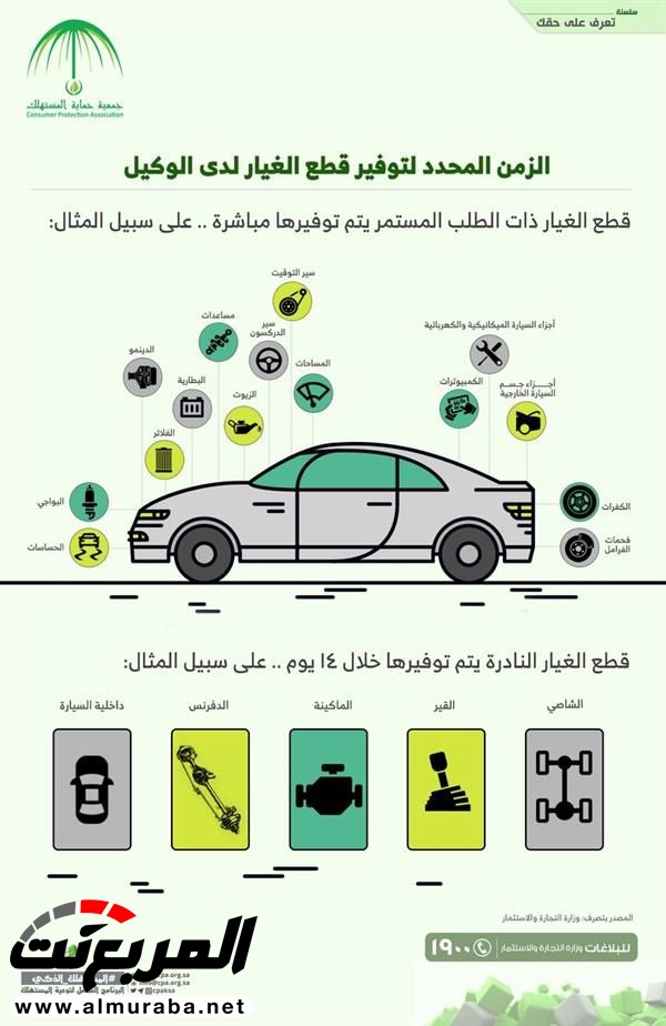 المربع نت – تعرف على المدة المطلوبة لتوفير قطع غيار السيارات عند إصلاحها لدى الوكيل (صورة)كشفت جمعية حماية المستهلك عن المدة المطلوبة لتوفير قطع غيار السيارات في حال إصلاحها لدى الوكيل، وذلك ضمن سلسلة “تعرف على حقك” التوعوية.