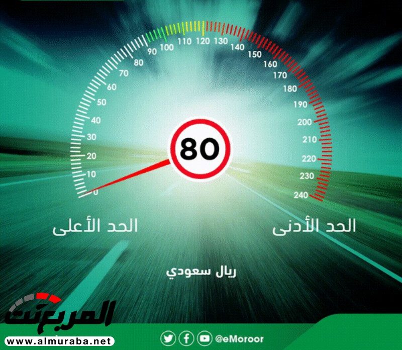 - في حالة تجاوز السرعة 80 يتم فرض غرامة مالية من 150–300 ريال لتجاوز 10-20 كم/س، و فرض غرامة 300-500 ريال لتجاوز 20-30 كم/س،