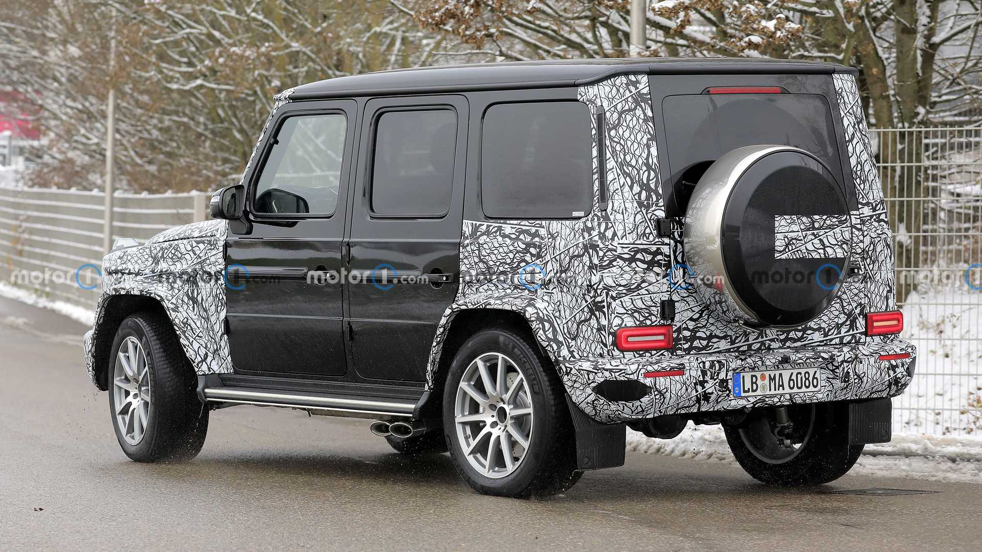 ظهرت مرسيدس جي كلاس في شتوتغارت، ألمانيا، بتحديثات بسيطة بالمصد الأمامي بالشبكات الهوائية وبعض الإنحناءات التصميمية الجديدة للمساعدة على التعرف على نسخة الفيس ليفت من النسخة الحالية، ويظهر المقطع الخلفي من جي كلاس بنفس التصميم الحالي بدون تغيرات، حيث يصعب أيضاً التعرف على التحديثات الطفيفة بسبب الغطاء التمويهي.
