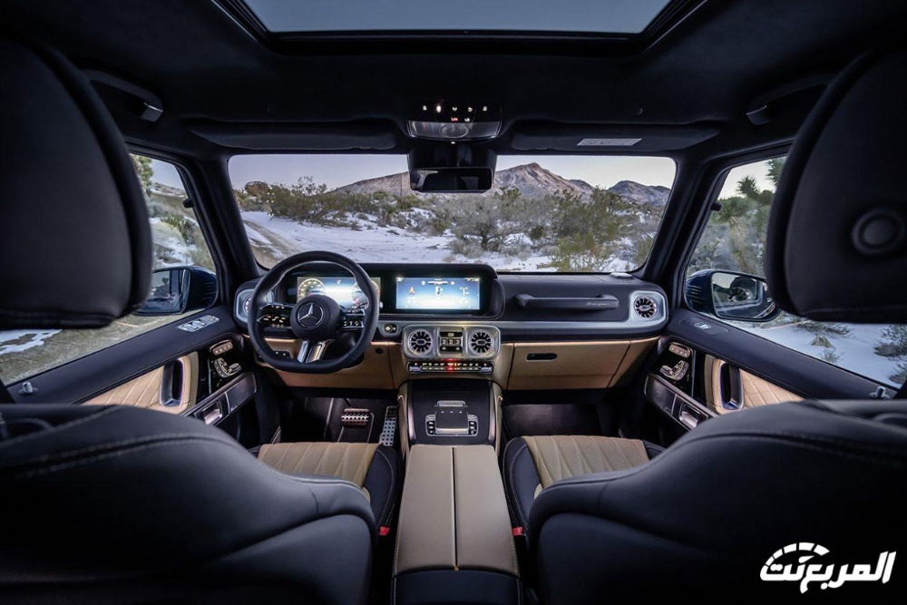 بالانتقال إلى داخلية مرسيدس جي كلاس 2025، نجد أنها قد حصلت على مقصورة فخمة بمستوى متقدم من التجهيزات الفاخرة مع العديد من خيارات التخصيص للداخلية من حيث التجهيزات أو الألوان أو الخامات المستخدمة.