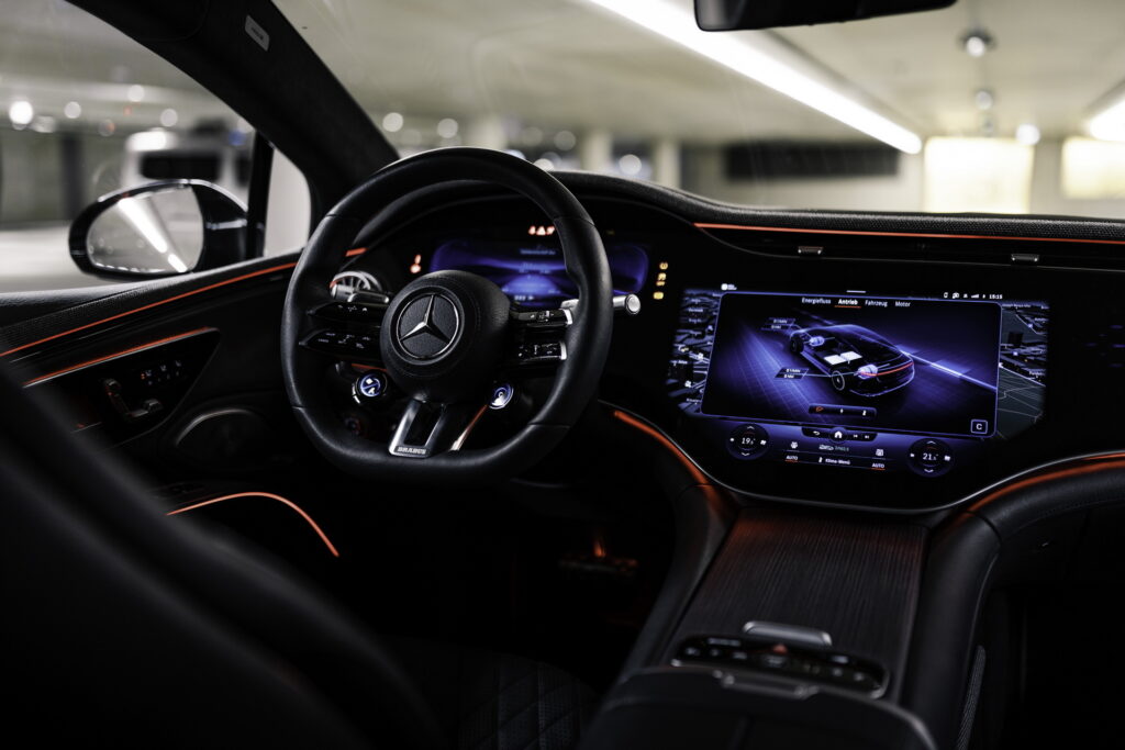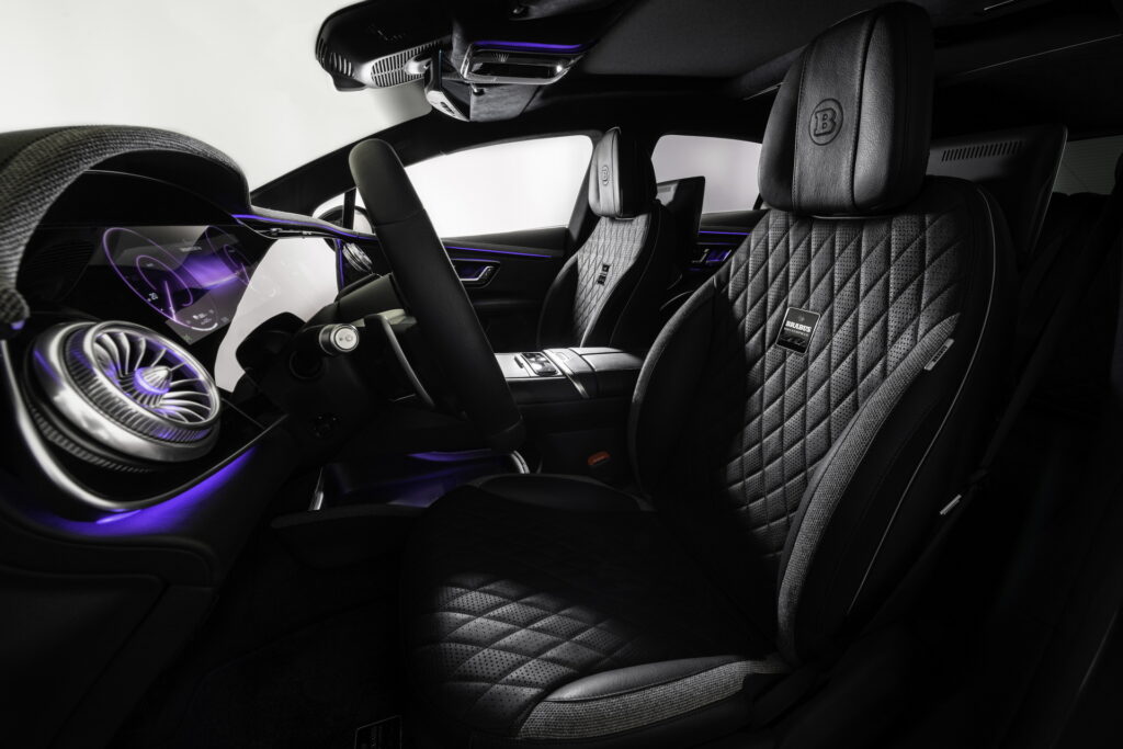 بالإضافة إلى التعديلات الخارجية الرياضية، حصلت مرسيدس AMG EQS 53+ على داخلية مجددة بالكامل، بجلد مبطن عالي الجودة مطرز يدوياً، مع العديد من القطع المكشوفة من ألياف الكاربون لتعزيز الطابع الرياضية بداخلية السيارة، ولا تعد هذه هي التعديلات الوحيدة المتوفرة للداخلية، حيث توفر برابوس حزمة كبيرة من التعديلات وفقاً للطلب للداخلية.