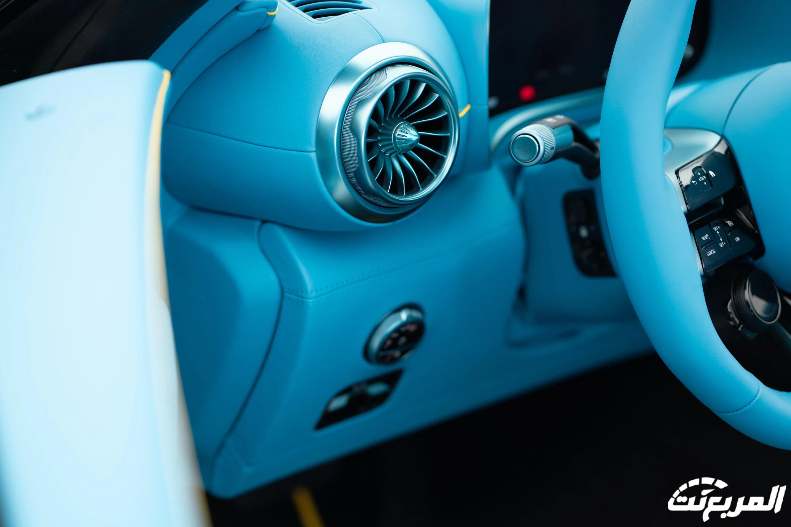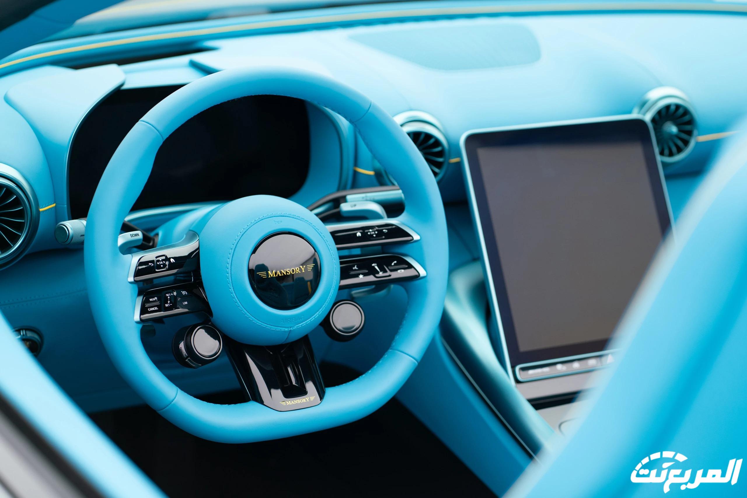 انتقل اللون الأزرق الفاتح من المظهر الخارجي للسيارة إلى الداخلية ليسيطر على كافة القطع الداخلية تقريباً بجانب قطع مصنعة من ألياف الكاربون ولمسات باللون الأصفر الفاتح، مع شعارات مانسوري المطرزة على المقاعد.
