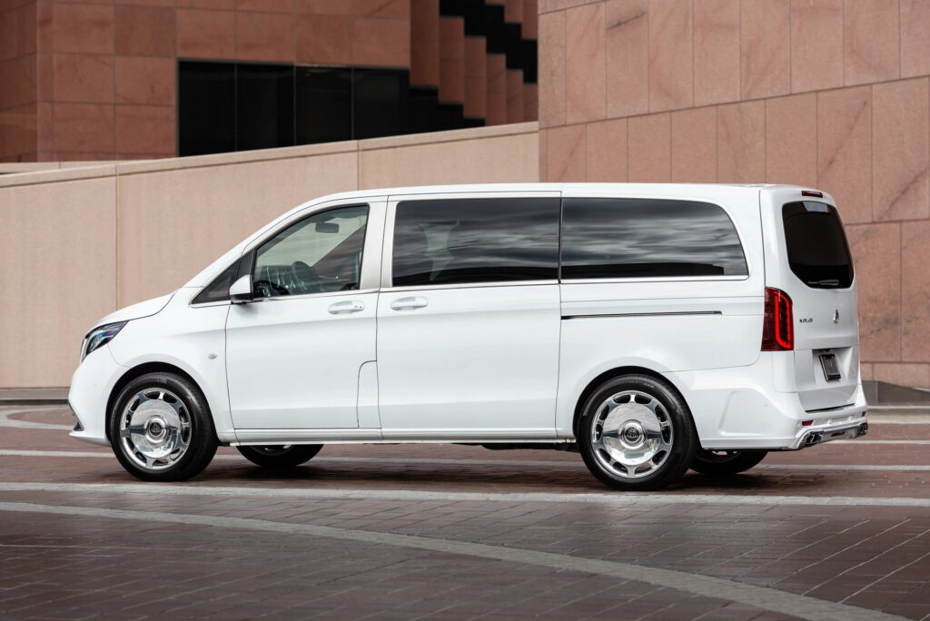 بالإضافة لحصولها على إضاءة نهارية LED لزيادة المظهر الفاخر لمقدمة الميني فان، وعند النظر على التصميم الجانبي نشاهد العجلات الرياضة بشعار مايباخ بقياس 19 إنش مع إطار من الكروم حول الزجاج الجانبي، وصولاً للمقطع الخلفي حيث نشاهد المصابيح الخلفية المعدلة بشريط LED مع شعارات مايباخ ومشتت هواء بمنافذ عادم مزيفة.