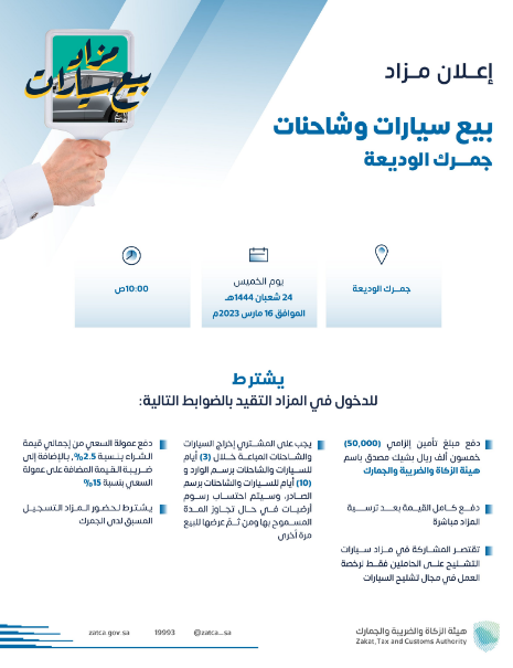 ونوهت هيئة الزكاة والضريبة والجمارك إلى أنه قد يتم استبعاد بعض السيارات والشاحنات المعروضة في هذه المنصة، وذلك في حال قام أصحاب الشأن بفسحها قبل موعد إقامة المزاد وفق أحكام نظام قانون الجمارك الموحد.
