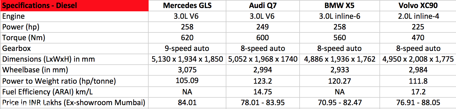 باستثناء فولفو XC90، باقي سيارات الإس يو في تحتوي على محركات توربينية بالديزل بست إسطوانات بدون اختلافات كبيرة في القوة، حيث ان المرسيدس GLS بمحركها 3.0 لتر وست إسطوانات يعرض عزم دوران أفضل من نظرائه، بينما الأودي Q7 يعرض أداء أفضل إلى حد ما بفضل هيكله الـ MLB Evo خفيف الوزن.