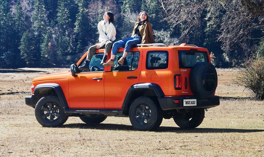 أبرز ما يميز التصميم الخارجي لسيارة تانك 300 الجديدة هي الجسم الصندوقي تعتليه الخطوط العضلية والمصابيح الدائرية تجمع بين الكلاسيكية والجرأة، ويتجلى جانب الجرأة والقوة مع الشبك الكبير البارز والمصدات والرفارف البارزة باللون الأسود.