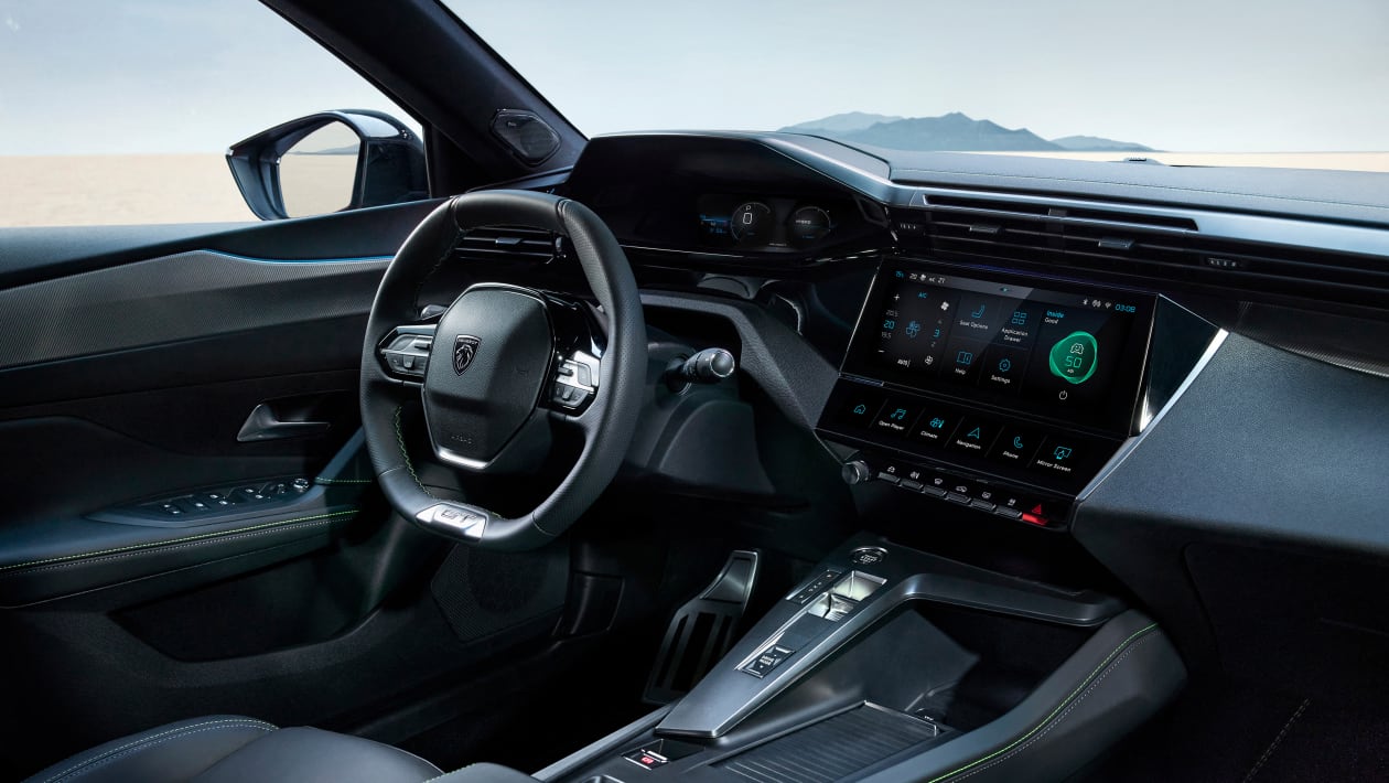 ولم تخلو المقصورة من تلك اللمسات الرياضية، فتأتي من الداخل مع تصميم i-Cockpit المألوف تصميم رياضي ومدمج للمقود..