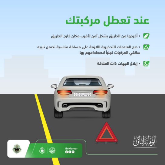 المربع نت – دعت الإدارة العامة للمرور السعودي، قائدي السيارات إلى ضرورة الالتزام بعدد من الضوابط يجب اتباعها في حال تعطل المركبة أو حدوث أي طارئ أثناء السير على الطريق.