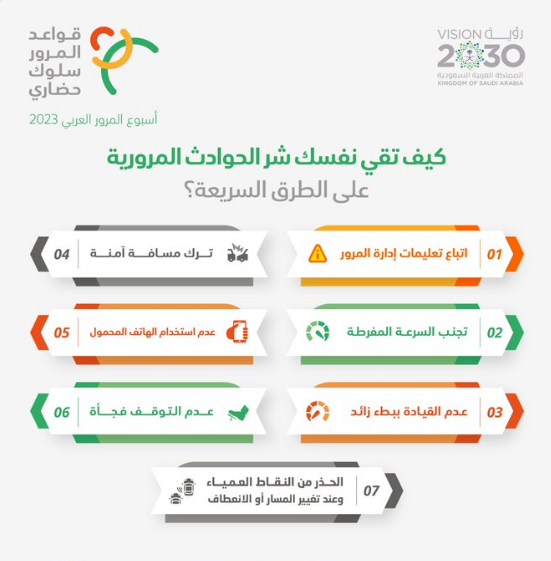 1- اتباع تعليمات إدارة المرور، لتعزيز السلامة المرورية أثناء القيادة.