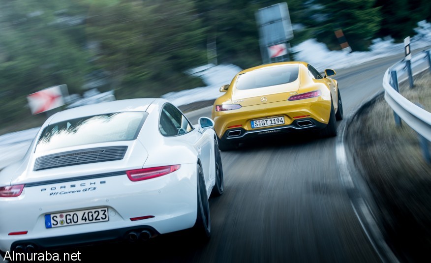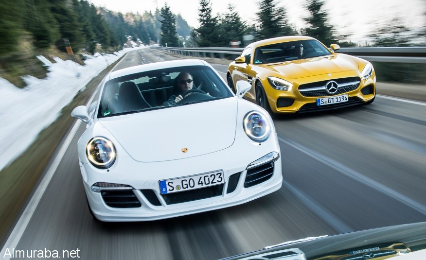الآن فقط ولأول مرة يواجه نموذج 911 تحدياً مباشراً من نفس الشركة في بلده وهي مرسيدس فبعد أن فشلت في جعل نموذج Gullwing SLS كأفضل سيارة في العالم، إختارت شركة مرسيدس Mercedes الإنتقال إلى اسفل الشريحة بسيارتها AMG GT، السيارة التي تستهدف نموذج 911 والتي تحتل المرتبة الأولى في نماذج طراز GT S وفي الإختبار يظهر أنه يملك النسخة الأقوى من AMG هذا الأخير سعة 4.0 لتر بمحرك Twin-Turbocharged V8 ينتج قوة 503 حصاناً، وبالنسبة لسعره فسيبدأ ب 130,825 دولار في الولايات المتحدة.