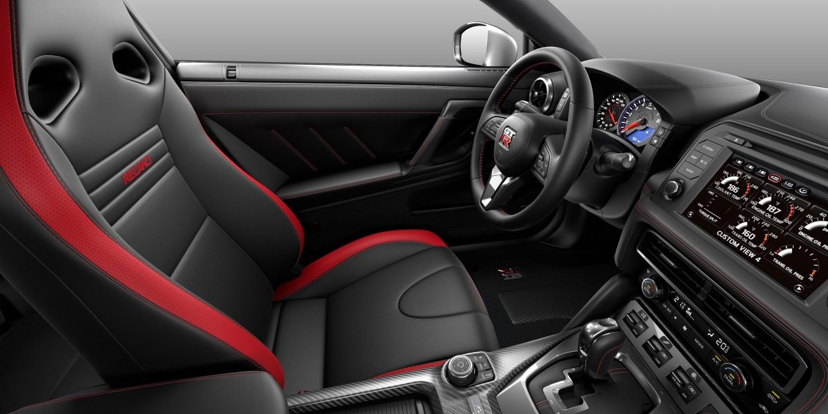 أما نيسان gtr من الداخل، فهي تُركز أكثر على التصميم الرياضي ومتعة القيادة في كل أجزاء المقصورة الداخلية للسيارة، وتخفيف الوزن أيضاً، حيث تأتي معظم الخامات من الداخل من الكاربون فايبر، مثل الكونسول الوسطي والمقاعد الأمامية وسقف السيارة؛ تأتي نيسان gtr بمقود من الجلد متعدد الوظائف، وخلف المقود توجد شيفتات لتبديل السرعة.