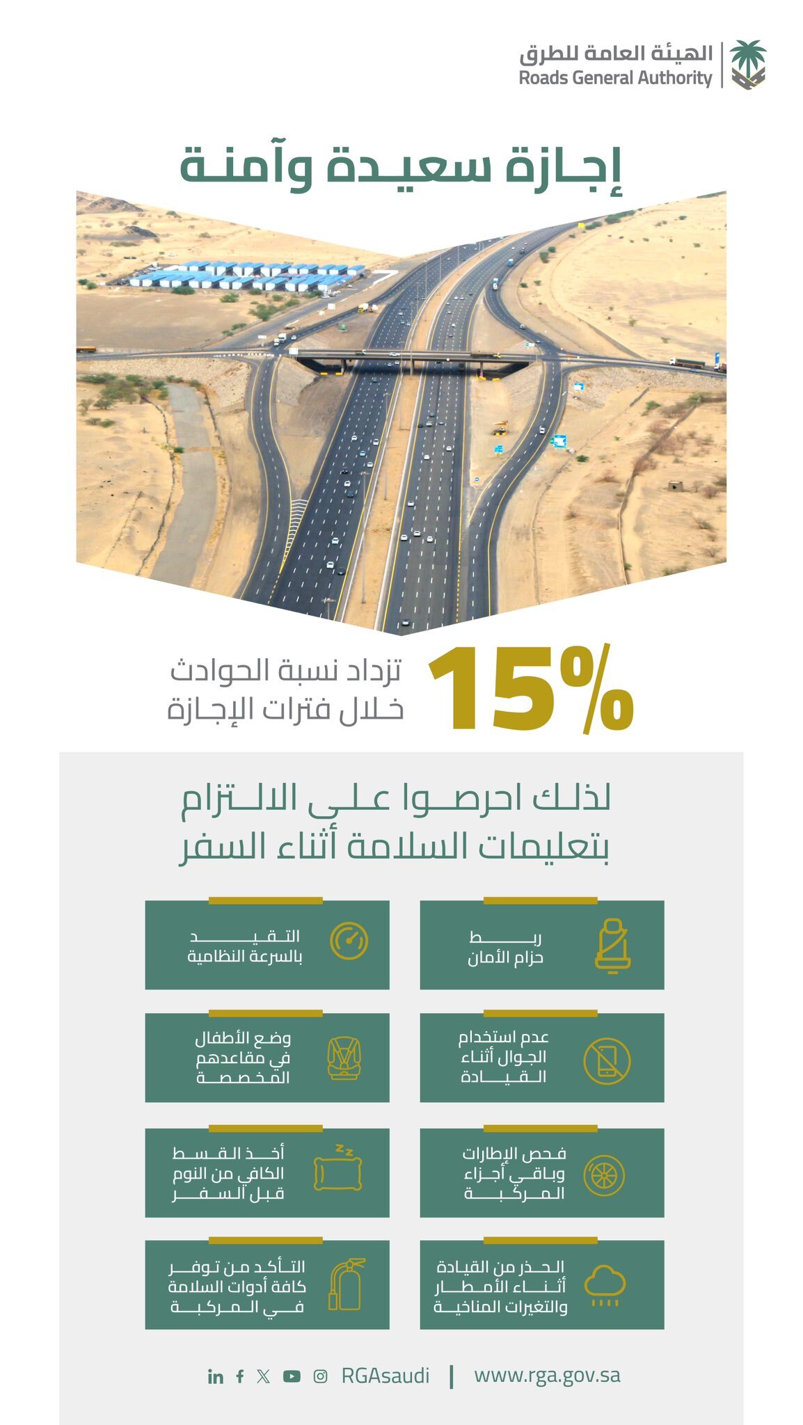 حرصًا على سلامة الجميع، وجهت هيئة الطرق من خلال إنفوجراف عبر منصة إكس، 8 إرشادات هامة يجب على قائدي المركبات اتباعها أثناء السفر، لتجنب وقوع الحوادث، ومنها التقيد بالسرعة النظامية وعدم الانشغال بالجوال، وفيما يلي نستعرض لكم كافة هذه الإرشادات.