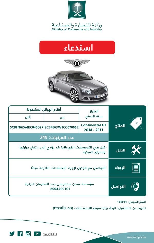 المربع نت – أعلنت وزارة التجارة والصناعة، اليوم الإثنين، استدعاء 633 سيارة “بنتلي” موديلات (2011 – 2014)، بسبب خلل في التوصيلات الكهربائية، قد يؤدي إلى ارتفاع حرارة السيارة واحتراقها.