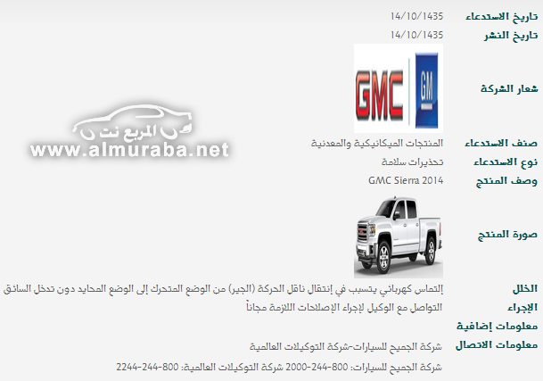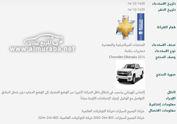المربع نت – أعلنت وزارة التجارة و الصناعة السعودية اليوم عن استدعاء عدد من سيارات شفرولية من طراز سلفرادو موديل 2014، وشمل قرار الاستدعاء 5566 سيارة وكذلك استدعاء جي ام سي من طراز سييرا موديل 2014 وشمل قرار الاستدعاء 2338 سيارة وذلك بسبب إلتماس كهربائي يتسبب في إنتقال ناقل الحركة (الجير) من الوضع المتحرك إلى الوضع المحايد دون تدخل السائق وطالبت الوزارة مالكي السيارات التي يشملها قرار الاستدعاء بالتواصل مع الوكيل لإجراء الاصلاحات اللازمة مجاناً.