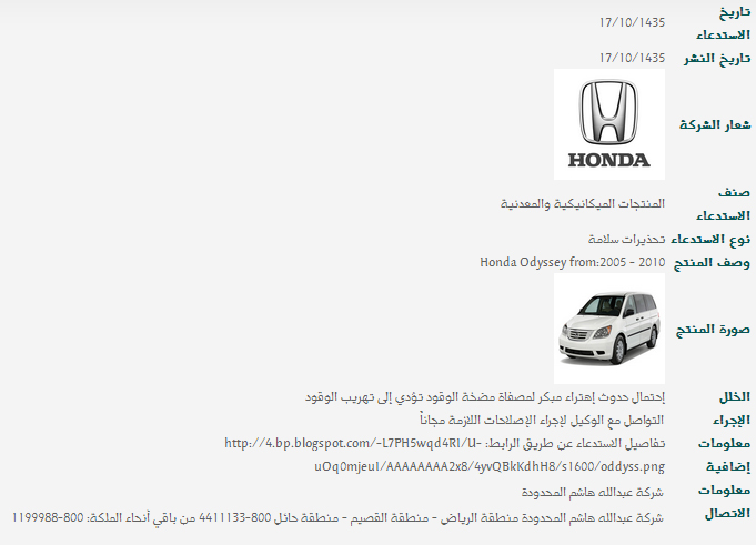 المربع نت – أعلنت وزارة التجارة و الصناعة السعودية اليوم عن استدعاء سيارات من طراز هوندا أوديسي, وشمل قرار الاستدعاء عدد 589 سيارة من موديل 2005 و552 سيارة من موديل 2006 و462 سيارة من موديل 2007 و353 سيارة من موديل 2008 و339 من موديل 2009 و637 سيارة من موديل 2010، بإجمالي عدد 2932 سيارة، جاء قرار الاستدعاء بسبب احتمال حدوث اهتراء مبكر لمصفاة مضخة الوقود تؤدى إلى تهريب الوقود، وطالبت الوزارة مالكي السيارات التي يشملها قرار الاستدعاء بالتواصل مع الوكيل لإجراء الإصلاحات اللازمة مجاناً.