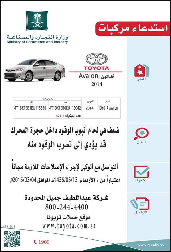 وأوضحت الوزارة أن الخلل قد يؤدي إلى تسرب الوقود من الأنبوب، داعية ملاك السيارة إلى التواصل مع الوكيل (شركة عبداللطيف جميل المحدودة)؛ لإجراء الإصلاحات اللازمة مجانا، ابتداءً من يوم الأربعاء 13 جمادى الأولى 1436هـ.