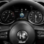 داخلية الفا روميو جوليا 2022تتميز السيارة بتصميمها الخارجي الأنيق والمتميز، كما تتمتع بمقصورة داخلية متطورة، حيث يتناغم التصميم الجميل والتجهيزات المميزة للمقصورة الداخلية والمصممة بعناية للسائق، والتي توفر لك تجربة قيادة استثنائية. وتتوفر عجلة قيادة مكسوة بالجلد متعددة الوظائف، قابلة للتدفئة مع مفاتيح مدمجة لنقل الحركة، ومقاعد قابلة للتهوية والتعديل في 8 وضعيات تتوفر باللونين الأحمر والأسود أو بلون توباكو، بالإضافة إلى كونسول وسطي جديد مع لمسات من الألمنيوم والخشب، وإضاءة داخلية محيطة، مع لمسات من ألياف الكربون على لوحة العدادات، ومقاعد خلفية قابلة للطي. كما تتمتع المقصورة الداخلية لسيارة جوليا 2022، بشاشة عدادات ملونة TFT قياس 7 بوصة، و زر تشغيل المحرك أحمر في لوحة العدادات، وشاشة معلومات تعمل باللمس مقاس 8.8 بوصة، مع مزايا تفاعلية، ومنفذ طاقة 12 فولت، ونظام تكييف هواء أوتوماتيكي مع نظام جودة الهواء، بالإضافة إلى نظام الصوت الفاخر من هارمن كاردون مع 14 مكبر صوت، وتوفر نظام الملاحة ألفا ثلاثي الأبعاد، كما توفر لوحة شاحن لاسلكي للهاتف. أنظمة الأمان ومساعدة السائقحصلت السيارة على تقييم 5 نجوم من Euro NCAP، وحققت درجة سلامة 98% للركاب البالغين، ومن تجهيزاتها: