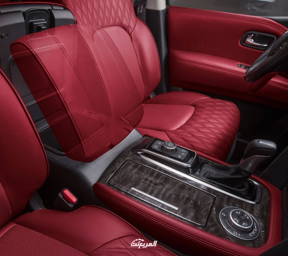 المربع نت – نيسان باترول هي أكبر سيارة SUV لدى الصانع الياباني في الوقت الحالي، متوفرة في السعودية لموديل 2023 بخيارين للمحرك، 6 أو 8 أسطوانات، بقوة 275 أو 400 حصان وعزم دوران 394 أو 560 نيوتن متر على الترتيب، وبأي محرك اخترت يُقترن بناقل حركة 7 سرعات أوتوماتيك ونظام دفع رباعي، مع 4 وضعيات قيادة، الطرق العادية والرمال والصخور والثلج. تأتي السيارة العائلية مع 3 صفوف من المقاعد تكفي 8 ركاب. وتتوفر بالعديد من الفئات باختلافات في مستوى التجهيزات حيث تجد المزايا المريحة والتكنولوجيا الأفضل في الفئات الأعلى، مثل فرش المقاعد قماش أو قماش مع جلد أو جلد أو جلد مبطن وشاشة وسائط 6.75 أو شاشة 12.3 بوصة مع دعم الاقتران اللاسلكي بآبل كاربلاي وأندرويد أوتو ونظام الصوت من 4 أو 6 سماعات أو نظام بوز الصوتي من 13 سماعة. والاختلافات حاضرة أيضا في التجهيزات الخارجية حيث أن جنوط العجلات يأتي بمقاس 18 أو 20 بوصة، وكشافات الضباب الأمامية غير موجودة في جميع الفئات. ويمكنك أن تضيف بعض مزايا الراحة في السيارة وأبرزها شاشات الترفيه في الصف الثاني المتوفرة من ضمن التجهيزات الاختيارية للفئات الأعلى. وأما فئة نيسمو فتتميز بالتوجه الرياضي القوي مع محرك خاص بها، وتخصيصات تصميمية من أجل أن تعكس الرياضية الجمالية، وتحصل على مقاعد خاصة ثنائية اللون من الجلد الطبيعي وألكانتارا.